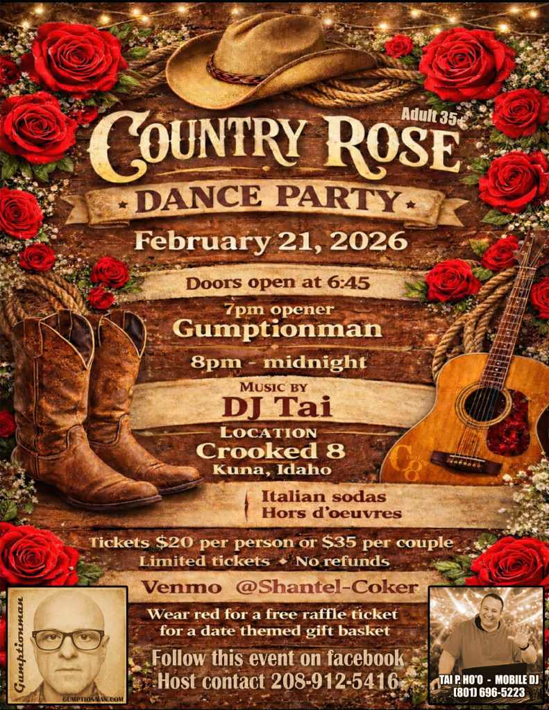 February 21st 2026 I’ll be the opener for the Country Rose Dance party at the Crooked 8 in Kuna Idaho. Come check me out and get your dance on later with DJ Tai!